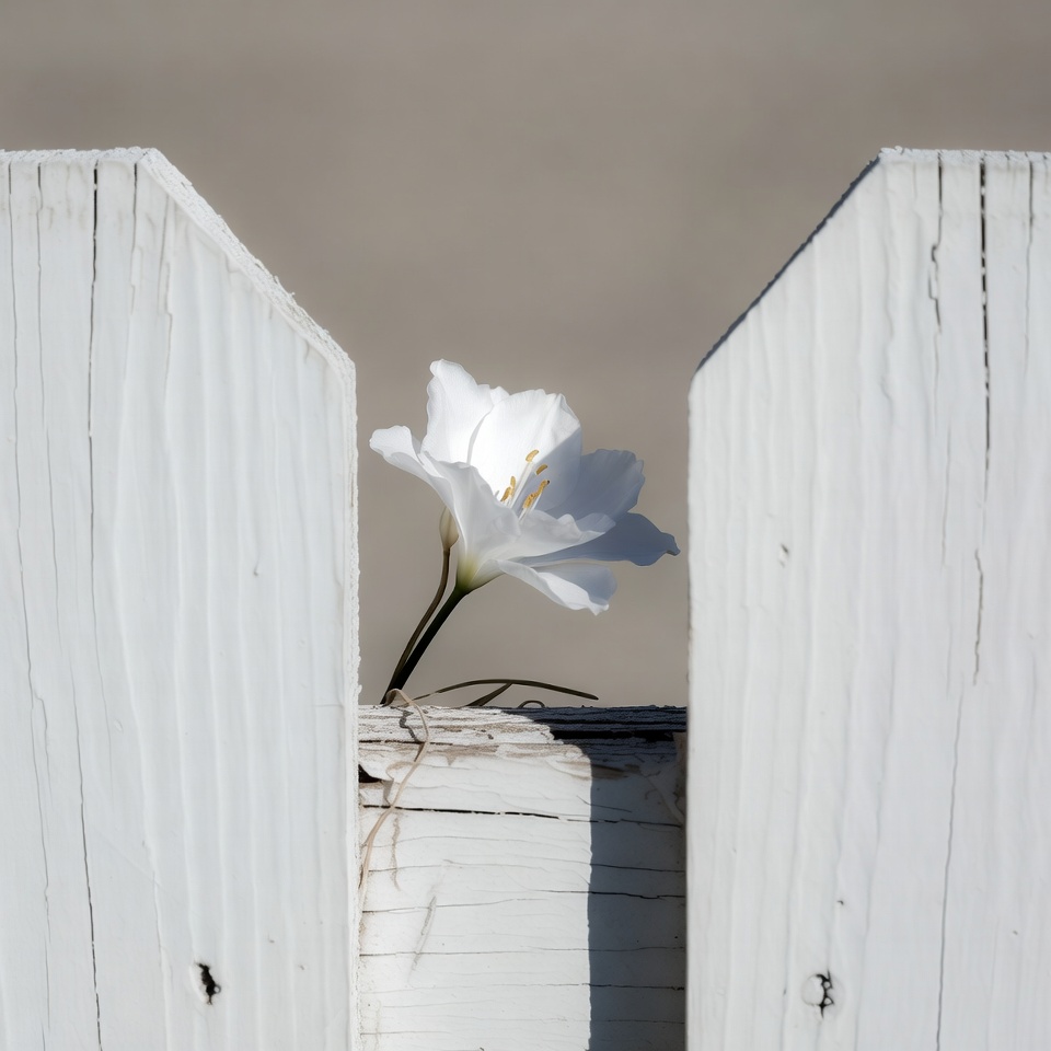 A white flower is seen growing through the gap in a wooden fence. The setting is simple and highlights nature's resilience.