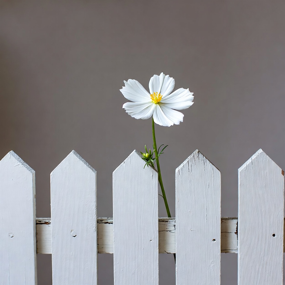 A single white cosmos flower with a yellow center stands tall behind a weathered white picket fence against a neutral background. The light is soft.