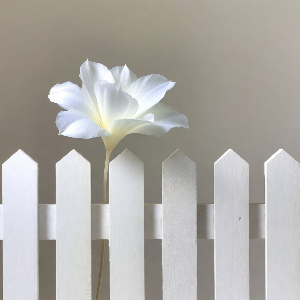 A delicate, white flower blooms against a short, white picket fence, creating a simple, minimalist composition with soft, natural lighting.