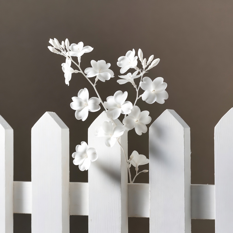 A branch of white flowers stands out, placed against a white picket fence. The background is simple.