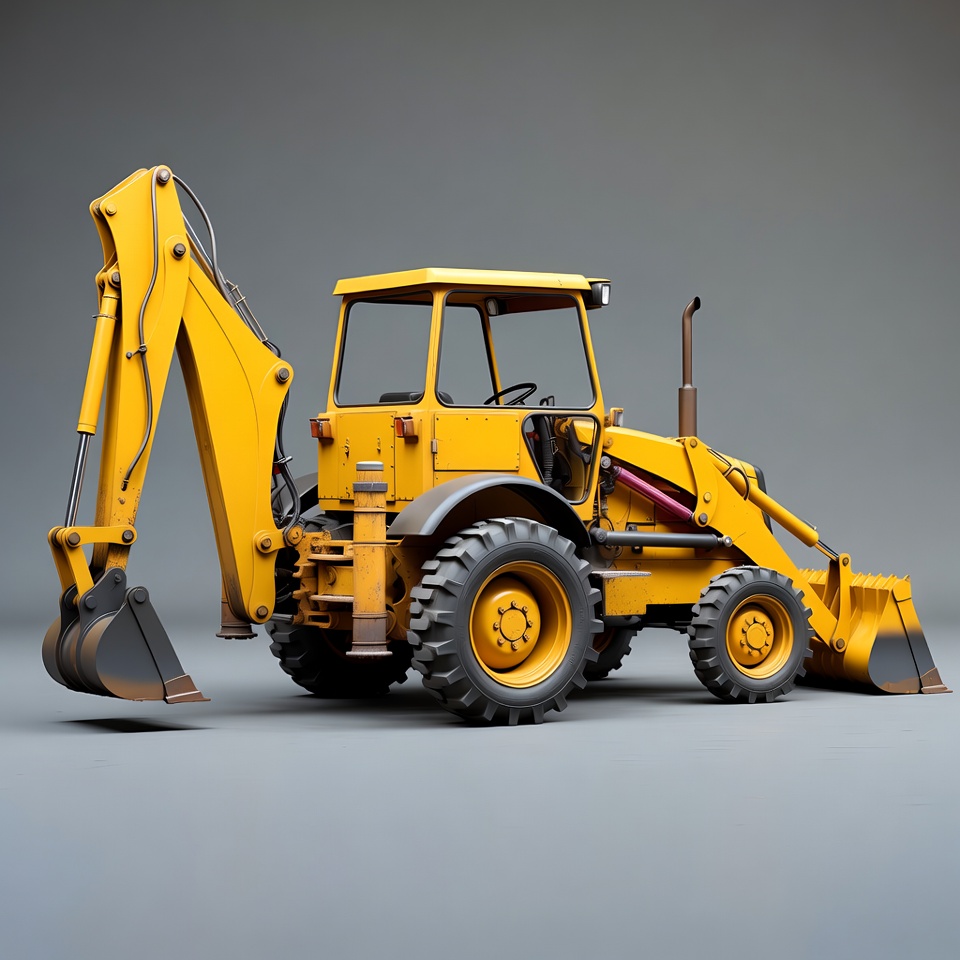 A yellow backhoe with a front loader is standing on a gray surface. The backhoe is ready to perform digging and loading tasks.