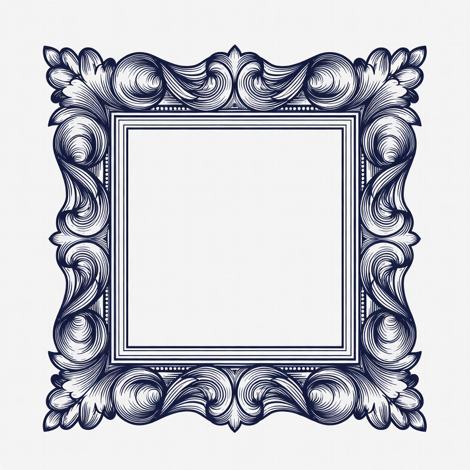 An ornate frame, featuring swirls and curves, suitable for holding a piece of art or photograph, drawn in simple lines.