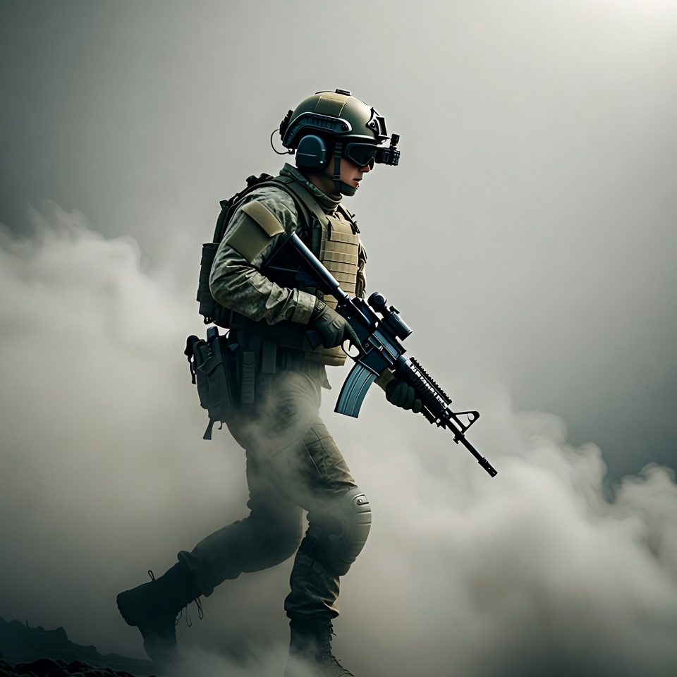 A soldier moves through thick smoke holding a rifle. The setting appears tense and focused on the task ahead.