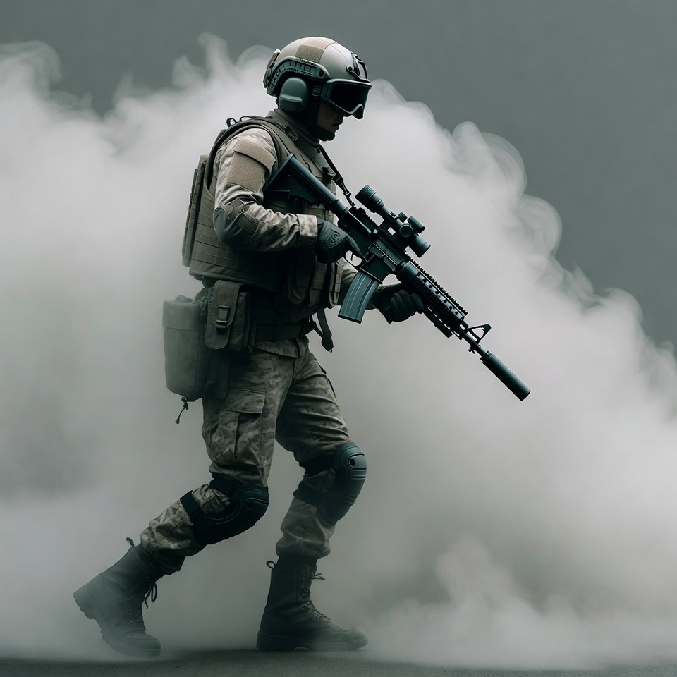 A soldier wearing full military gear walks with a rifle. Heavy smoke surrounds him. He wears a helmet and carries tactical equipment.