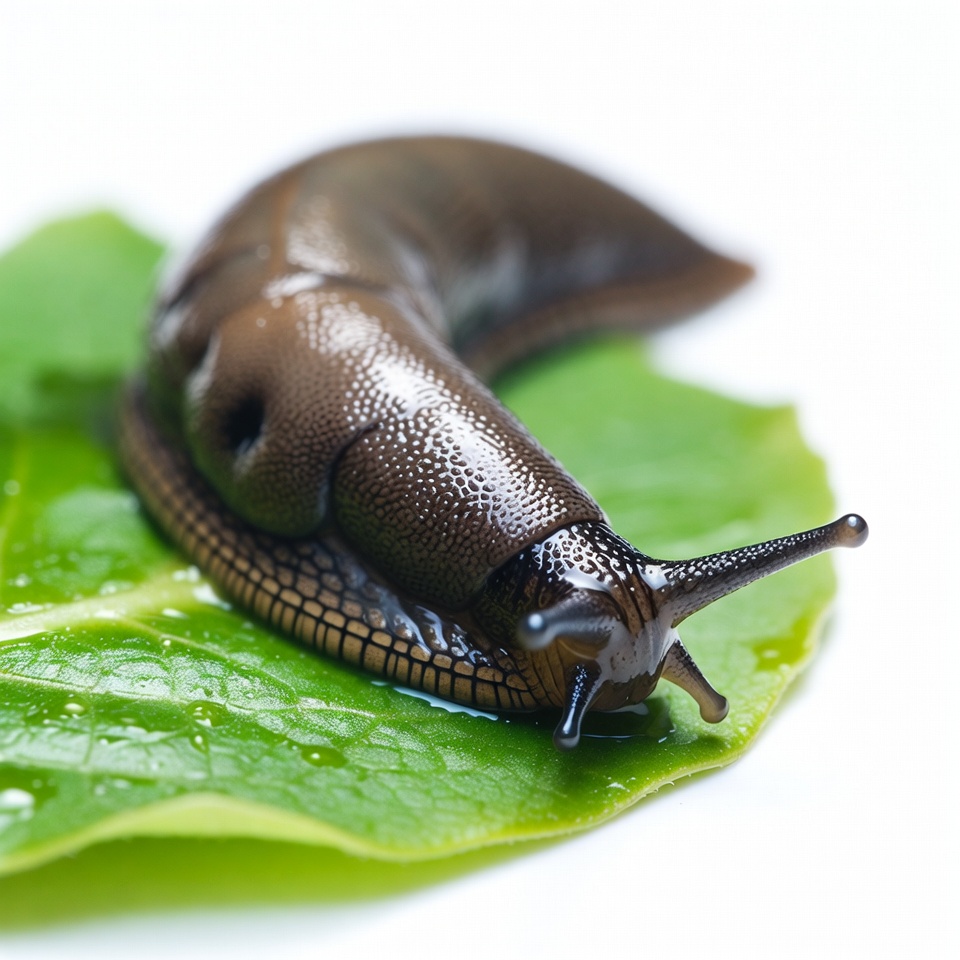 A snail crawls slowly on a green leaf, showing its body and tentacles. The setting highlights the details of the snail's shell and texture.