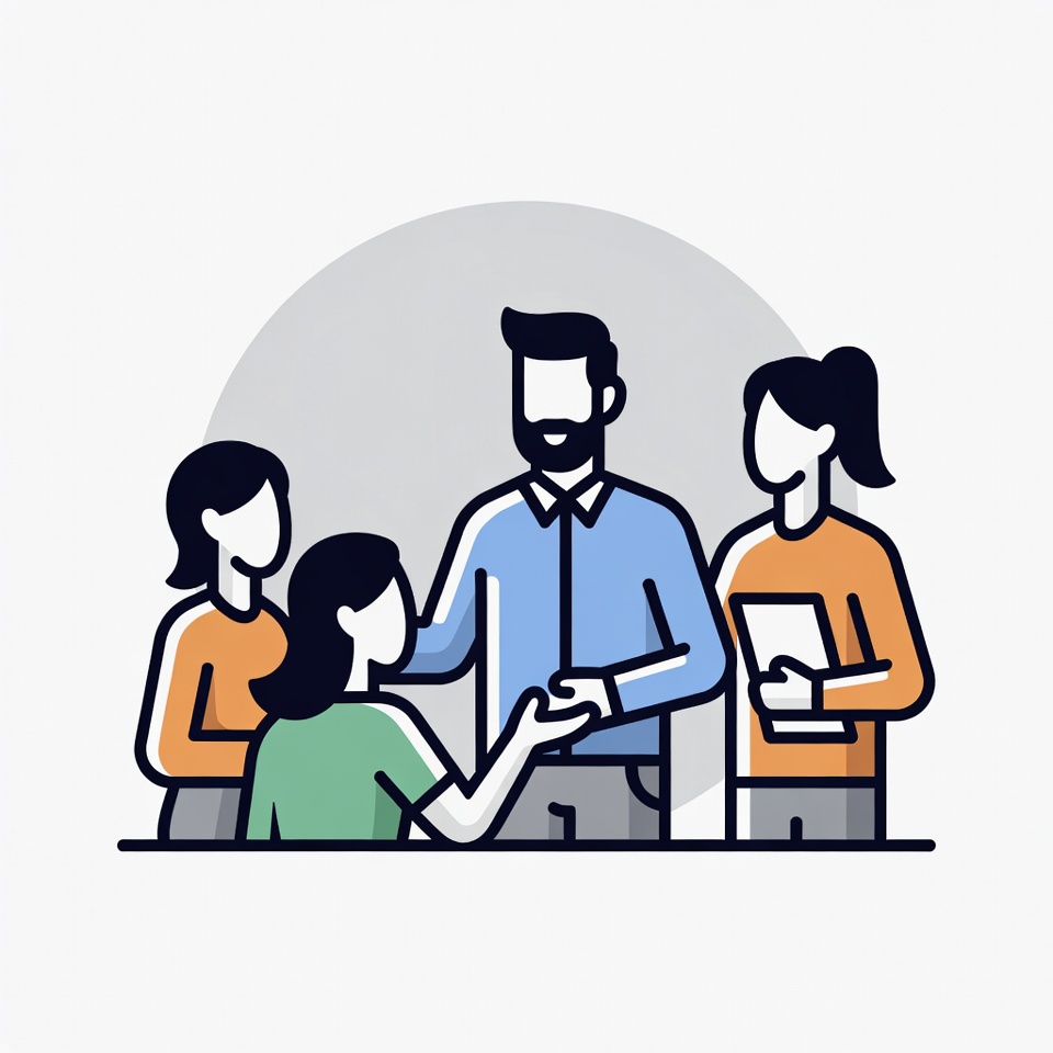 A group of four people talks in an office. One person shares documents while others listen and engage in the discussion.