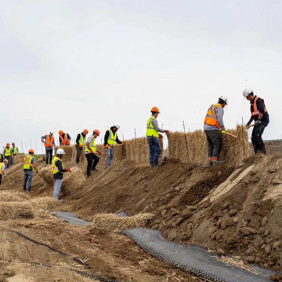 Workers in safety gear place straw bales while building a soil barrier on a construction site under a cloudy sky in a rural area.