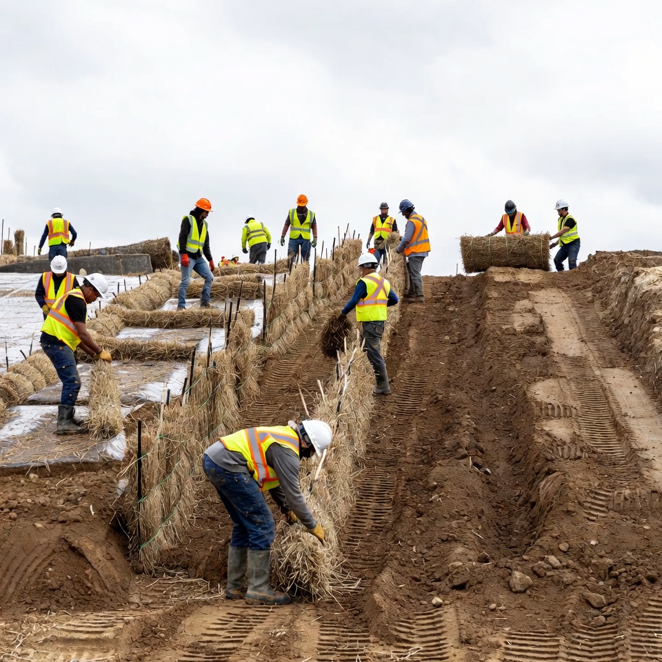 Workers are laying straw on sloped ground for erosion control at a construction site on a cloudy day. Safety vests are visible on the crew.