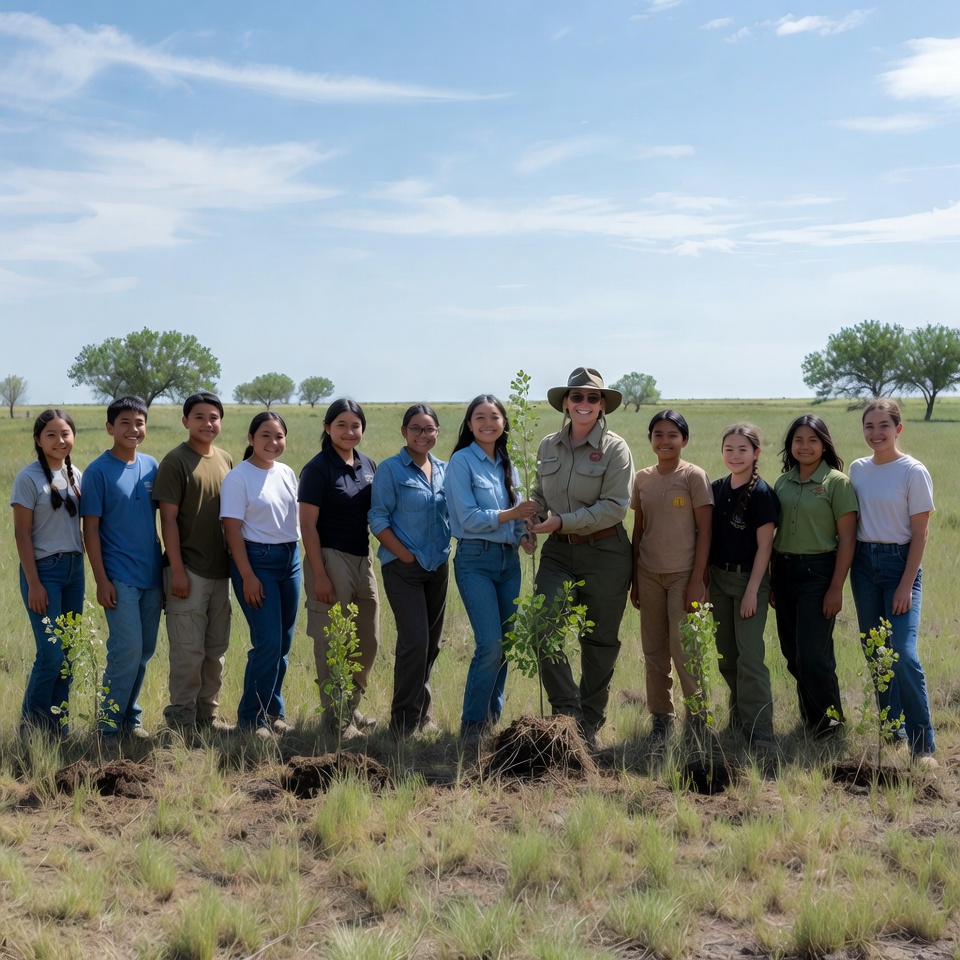 Group of teenagers work together in an open field to plant young trees during a sunny day. They showcase teamwork and community effort.
