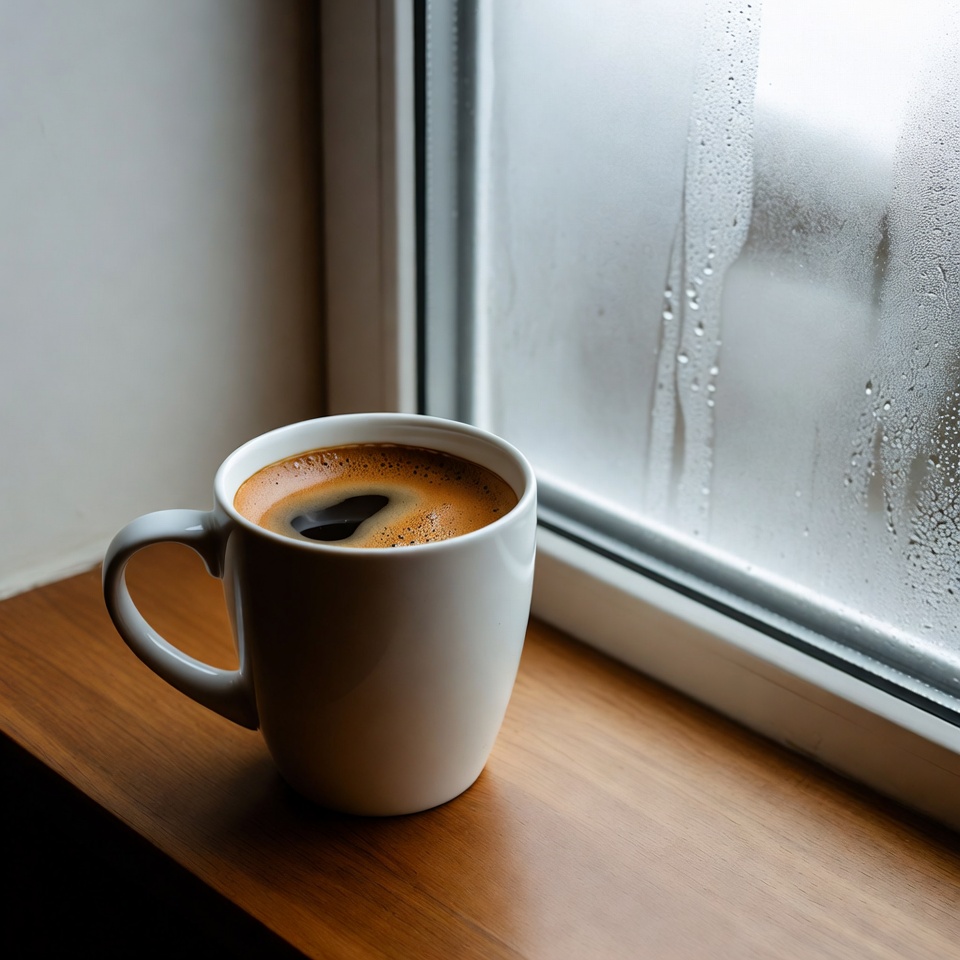 A coffee cup sits on a wooden window sill. The window has drops of water and shows a cloudy view outside.