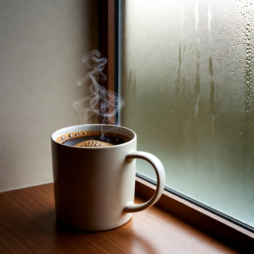 A warm cup of coffee sits on a wooden table next to a foggy window with steam rising from the surface. The scene is cozy and inviting.