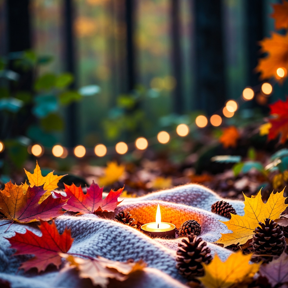 autumn, blanket, candle, cozy, decor, evening, fall, forest, gathering, glow, leaves, nature, outdoor, peaceful, pine cones, seasonal, string lights, sunlight, warm light, woodlands