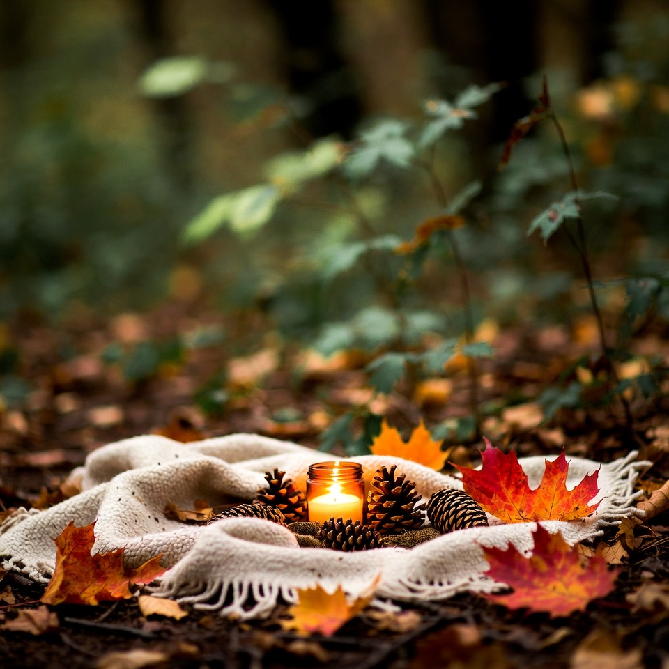 arrangement, autumn, blanket, candle, decoration, fall, foliage, forest, glow, leaves, light, nature, orange, outdoor, pine cones, scenery, seasonal, tranquil, warmth, woods