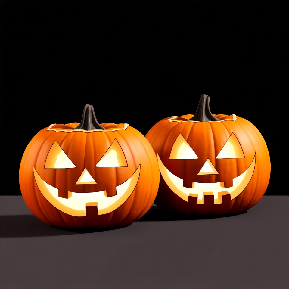 Two carved pumpkins show smiles as they glow in the dark. They sit on a wooden table against a black background during Halloween.