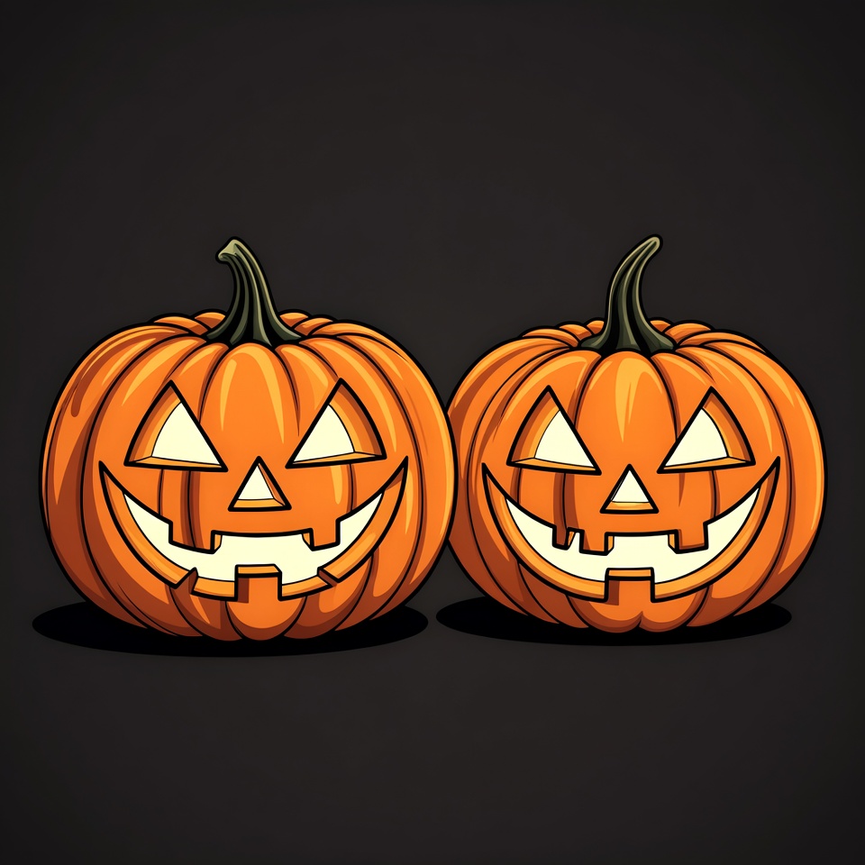 Two carved pumpkins smile at viewers during a Halloween celebration. The pumpkins have classic faces and bright orange skin.