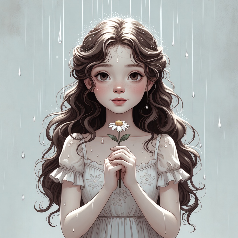 A girl stands in the rain, holding a flower close to her chest. Water droplets fall around her, creating a simple moment of stillness.