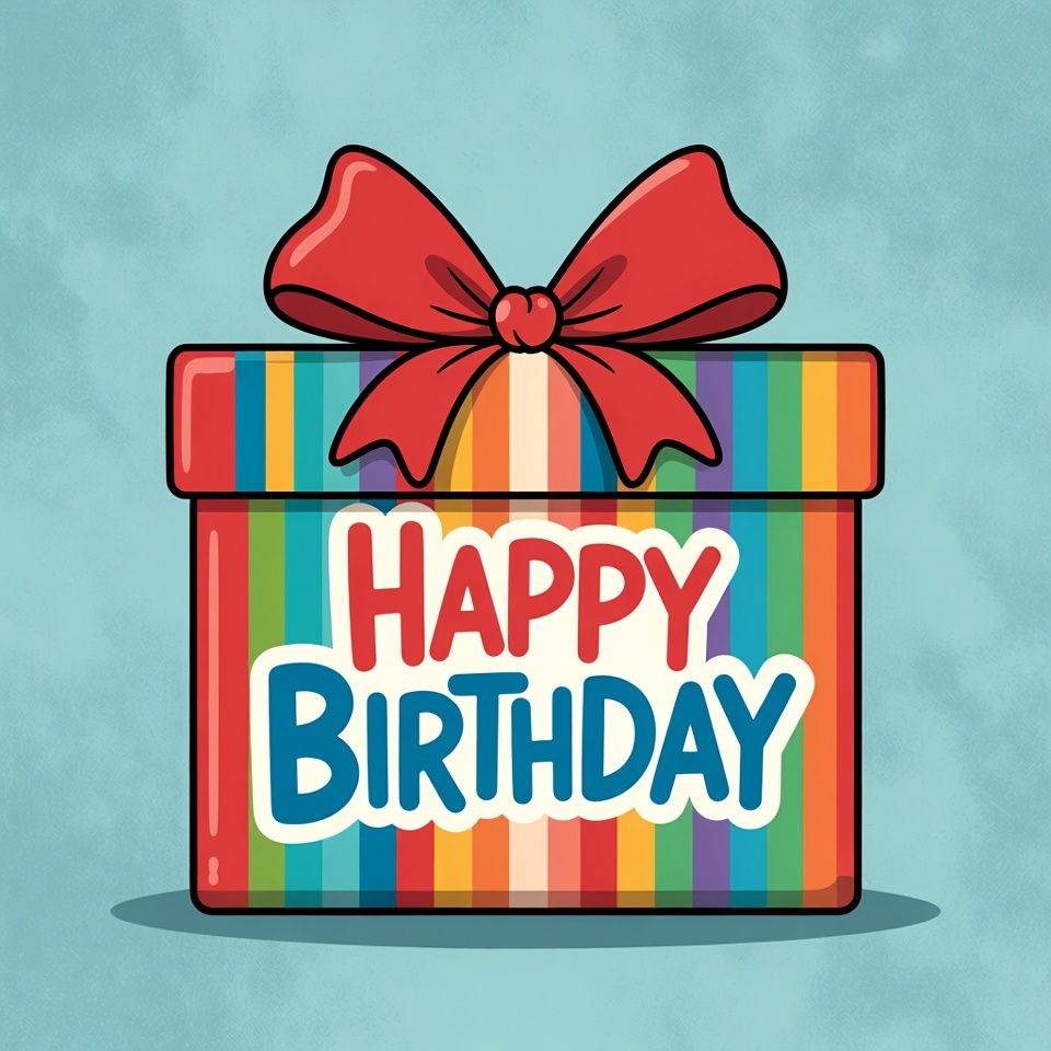 A vibrant gift box with a red bow sits on a blue background. The box has colorful stripes and says happy birthday in bold letters.
