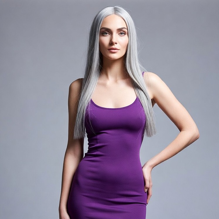 A model stands confidently, showcasing her long silver hair and a purple outfit in a simple studio setting.