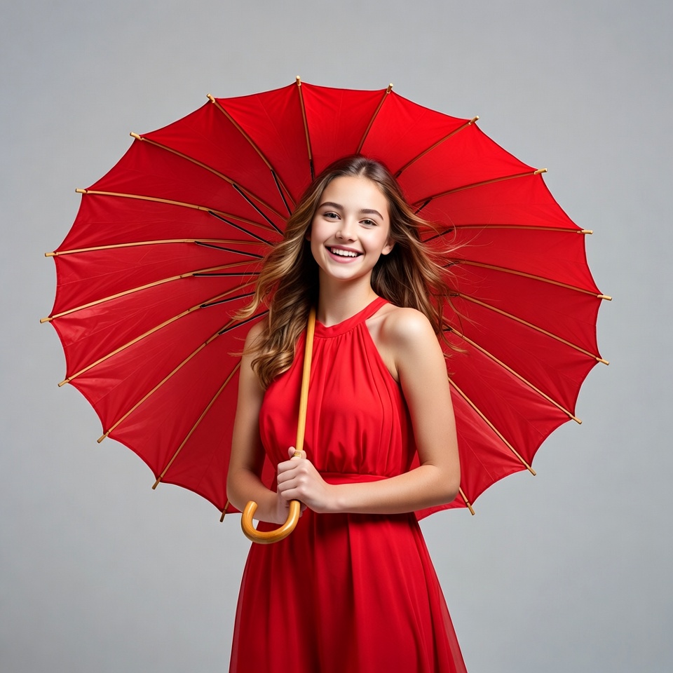 accessories, beauty, bright colors, cheerful, fashion, girl, happiness, indoor, light, modeling, playful, portrait, pose, red dress, simple background, smiling, studio, style, umbrella, youth