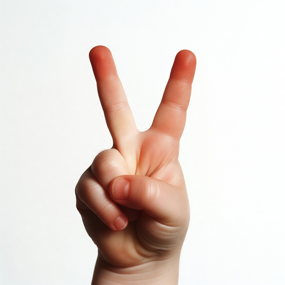 A hand shows a peace sign with two fingers raised. The background is plain white. The hand appears relaxed and open.