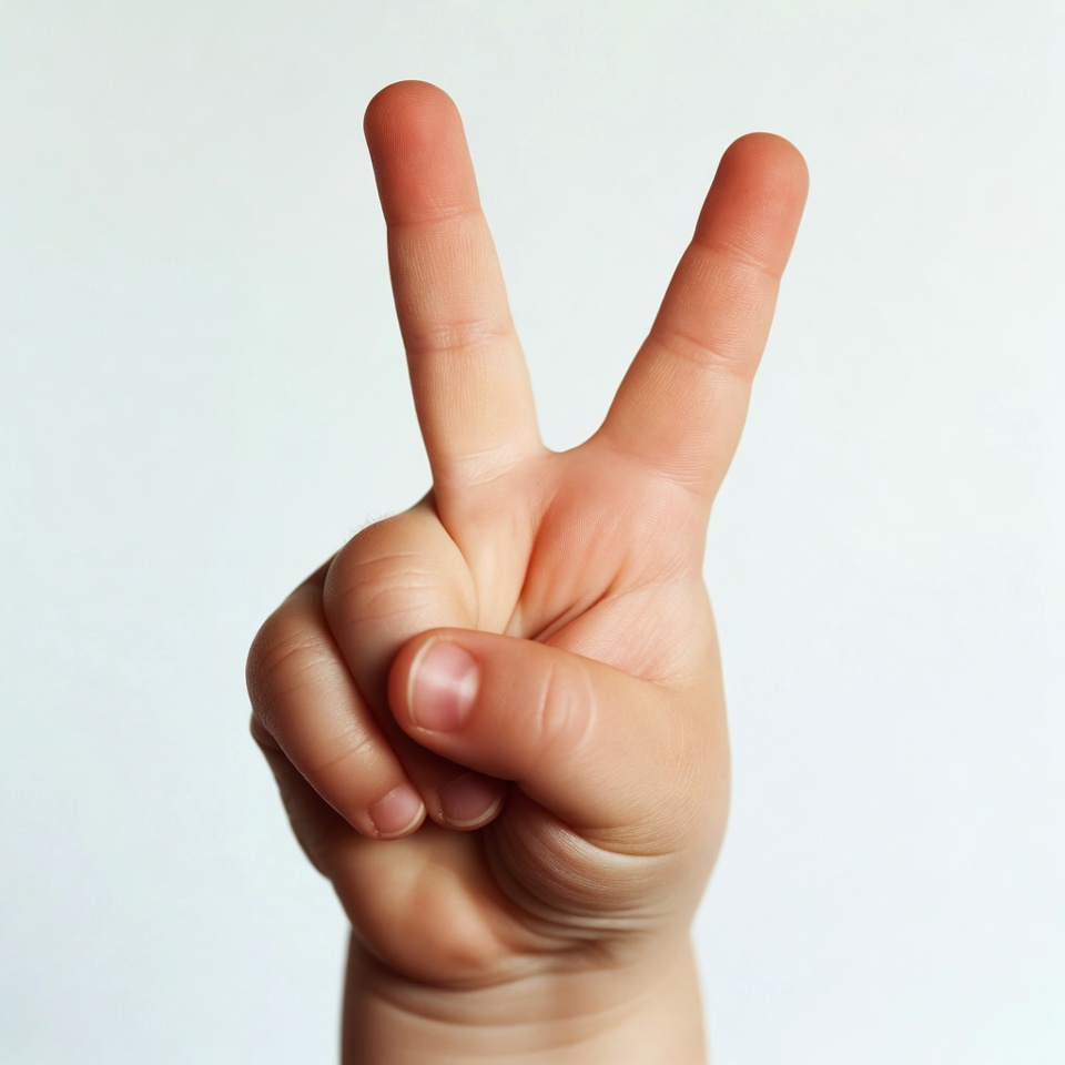A child's hand makes a peace sign gesture against a plain background. The fingers are raised with two points in the air.