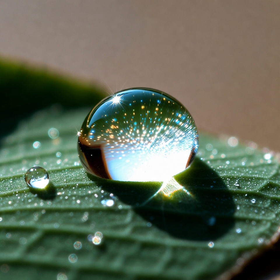 A water drop sits on a green leaf. The drop reflects light and small details from the surroundings. This scene captures nature's simple beauty.
