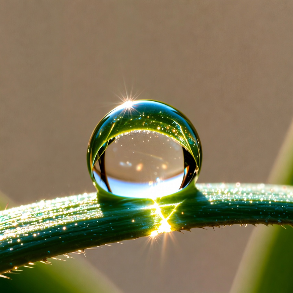 A water droplet sits on a green leaf, reflecting light as the sun shines. The scene shows nature with a focus on simple beauty in detail.