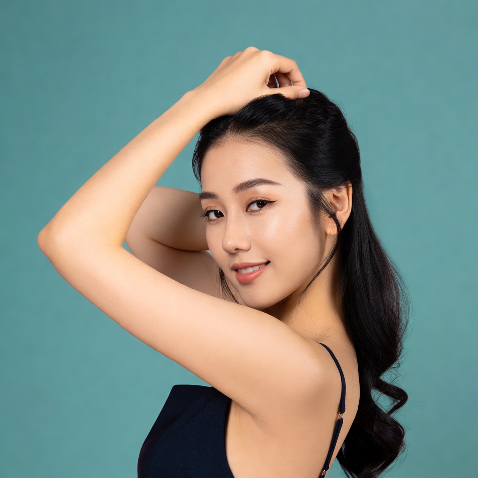 beauty, blue background, casual wear, confidence, dark hair, expressive, face, hair, hand, indoor, joy, model, natural light, portrait, pose, posing, smile, styling, woman, young adult