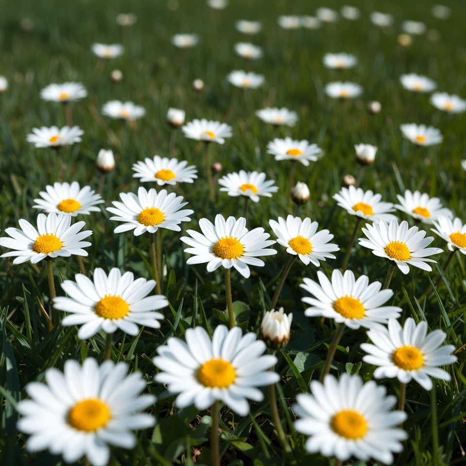 White daisies cover a grassy area under bright sunlight. Some flowers are fully open, while others are still buds.