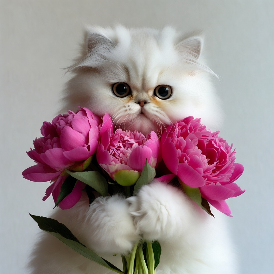 A white cat stands holding a bouquet of pink peonies. The background is plain, focusing on the cat and flowers.