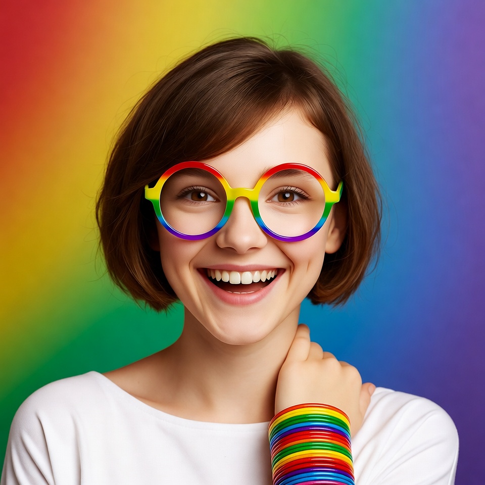 accessory, art, background, bright, colorful, creativity, design, expression, fashion, fun, girl, glasses, happy, joy, play, playful, rainbow, smile, style, youth