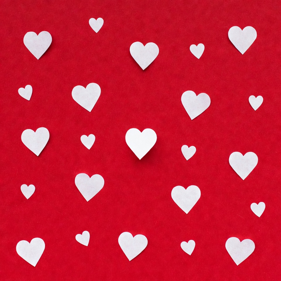 White paper hearts are scattered on a red surface. The hearts vary in size and are arranged in a random pattern.