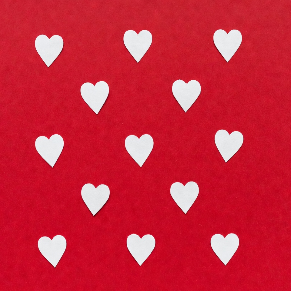 Small white paper hearts are arranged in rows on a red background. The design is bright and focuses on the shapes of the hearts.