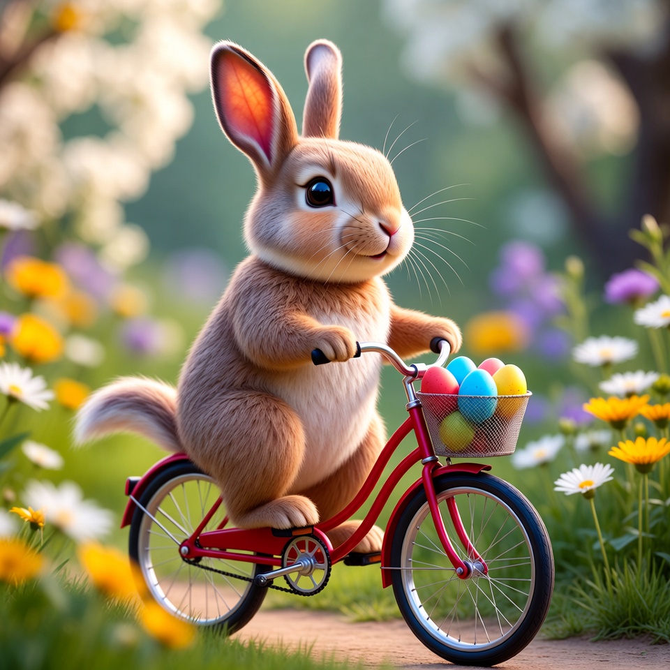 A rabbit rides a bicycle through a field of flowers. It carries colorful Easter eggs in a basket on the front.