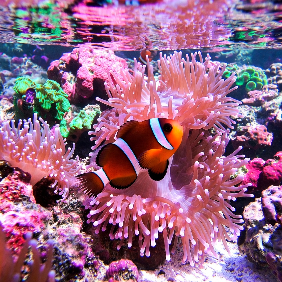 A clownfish swims among colorful coral and anemones in a vibrant underwater scene, showcasing marine life in a tropical ocean.