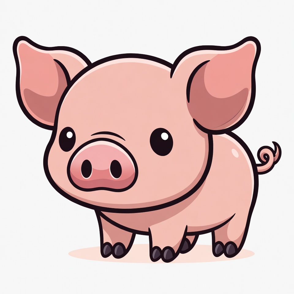 A cartoon pig stands on a flat surface. It has big eyes and a round body. The pig looks friendly and playful.