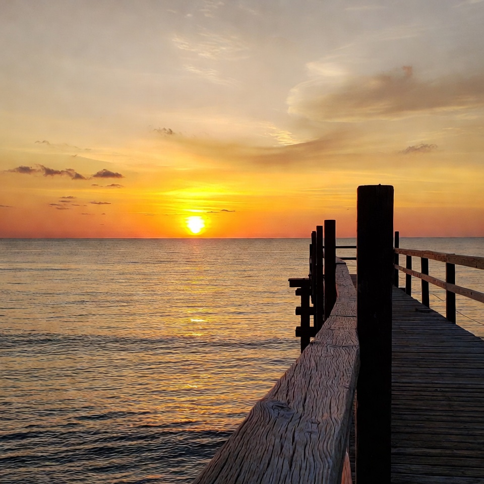 A wooden pier extends into the water at sunset. The sky shows warm colors as the sun sets on the horizon.