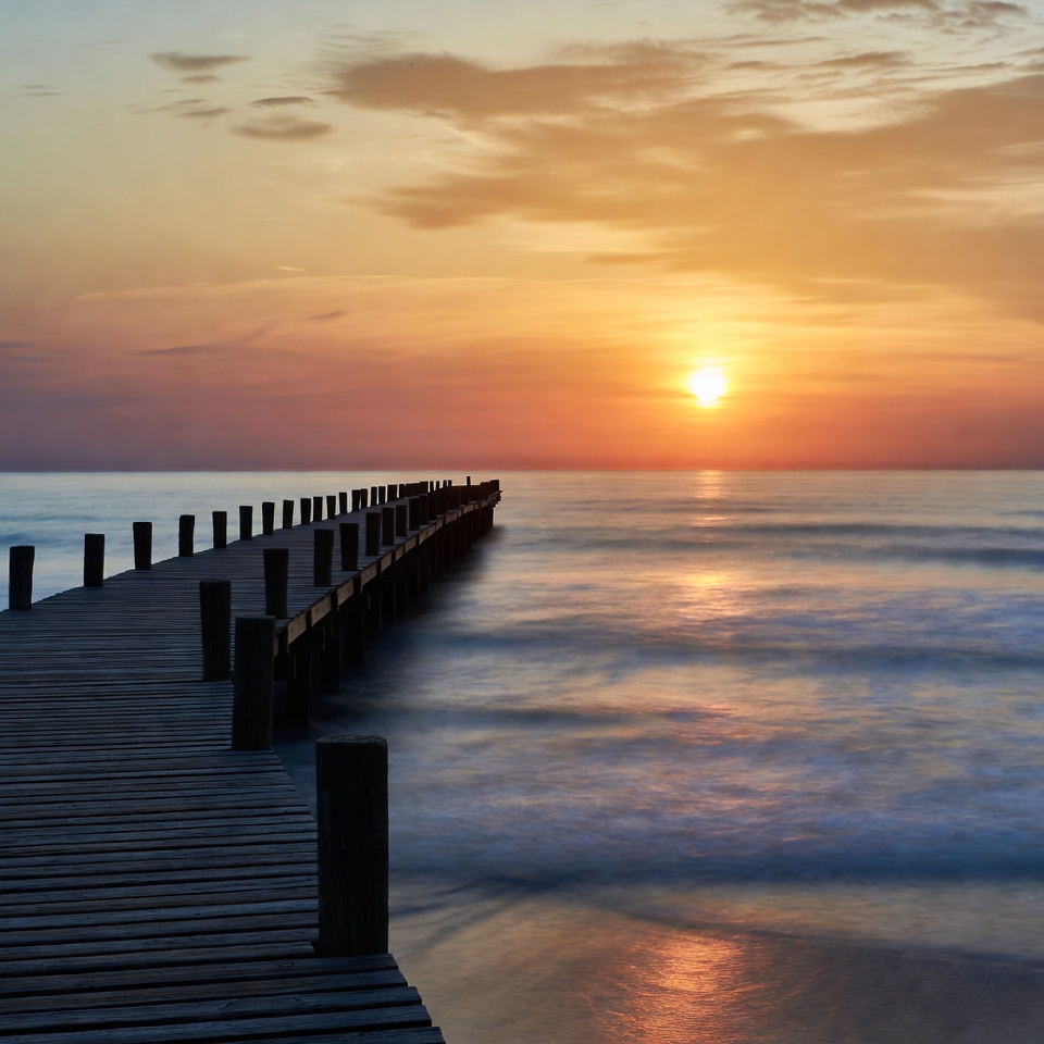 Sunset light shines on a long wooden pier stretching into the sea. Waves gently move in the water below.