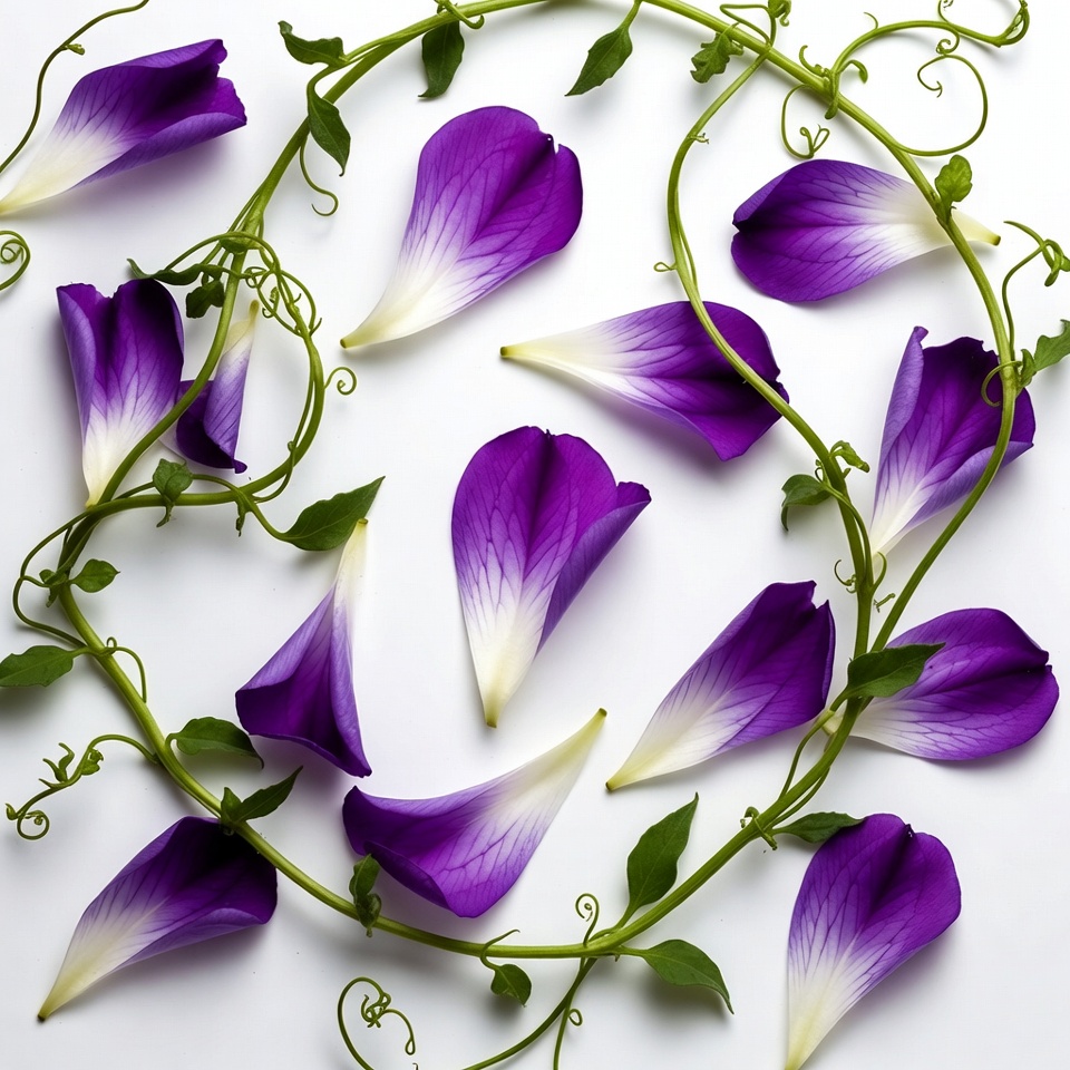 art composition, botanical, close-up, decoration, floral art, floral design, floral styling, flower arrangement, green vine, leaves, minimalistic, natural decor, nature, organic materials, plant elements, plant life, purple petals, scattered petals, white background, winding vine