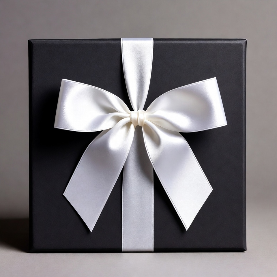 A black gift box sits on a gray surface. It has a white bow tied around it. The scene is simple and focused on the presentation.