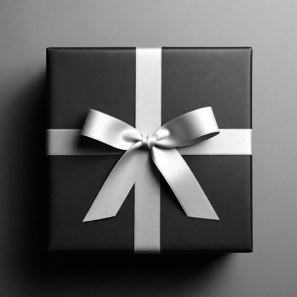 A black box wrapped with a silver ribbon sits on a surface. It is closed and ready for giving or receiving.