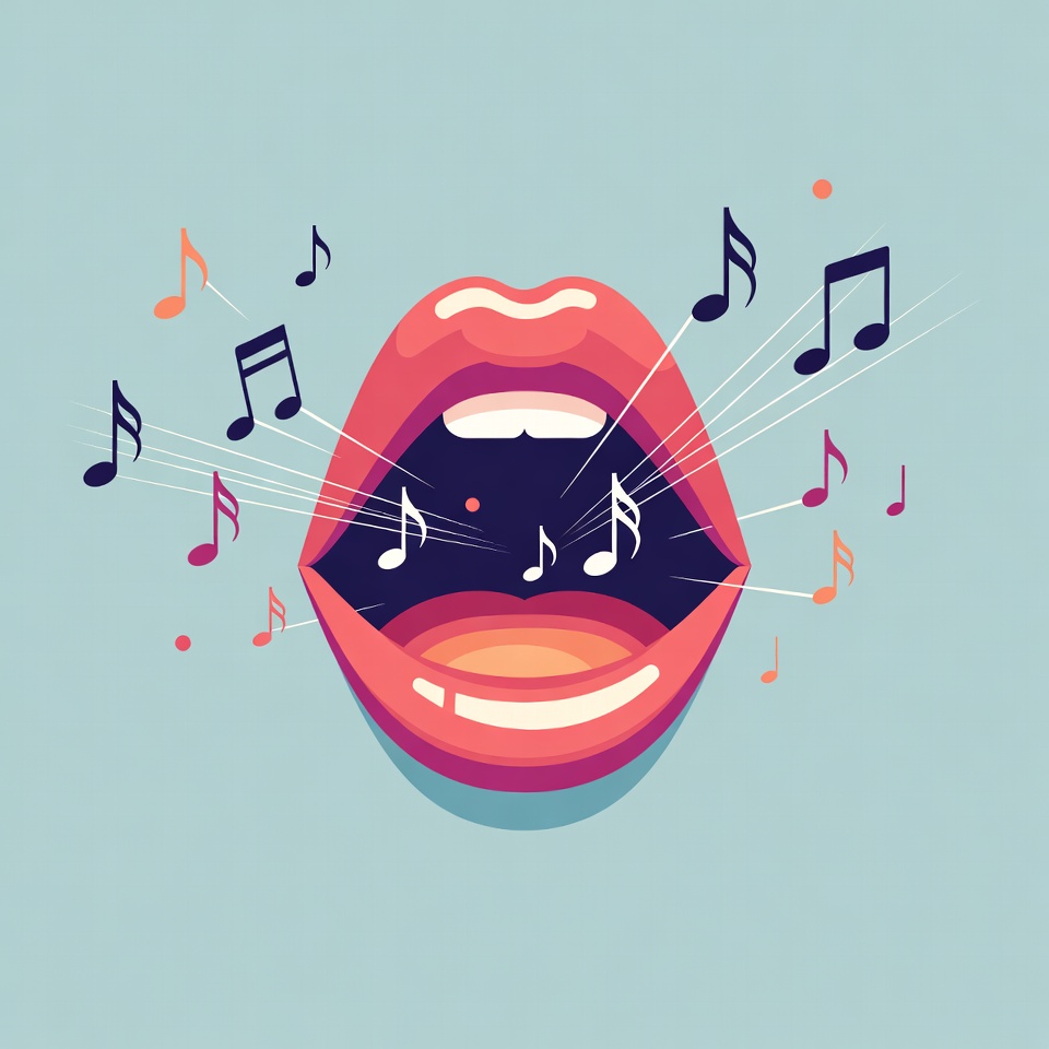 A bright mouth is opened wide, releasing musical notes into the air. Colorful notes swirl around, creating a lively scene.