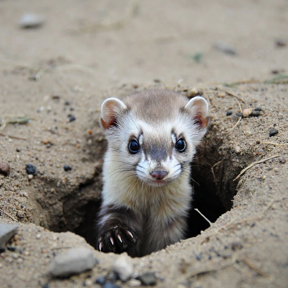 A small animal looks out from a hole in the ground. It has dark markings and a curious expression. The setting is sandy and natural.