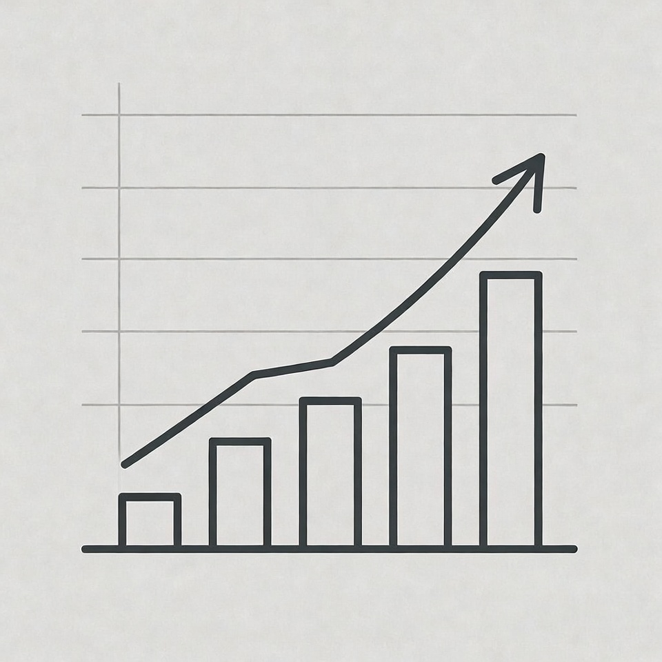 A line graph displays data trends with bars representing values increasing over time, showing a clear upward movement in results.