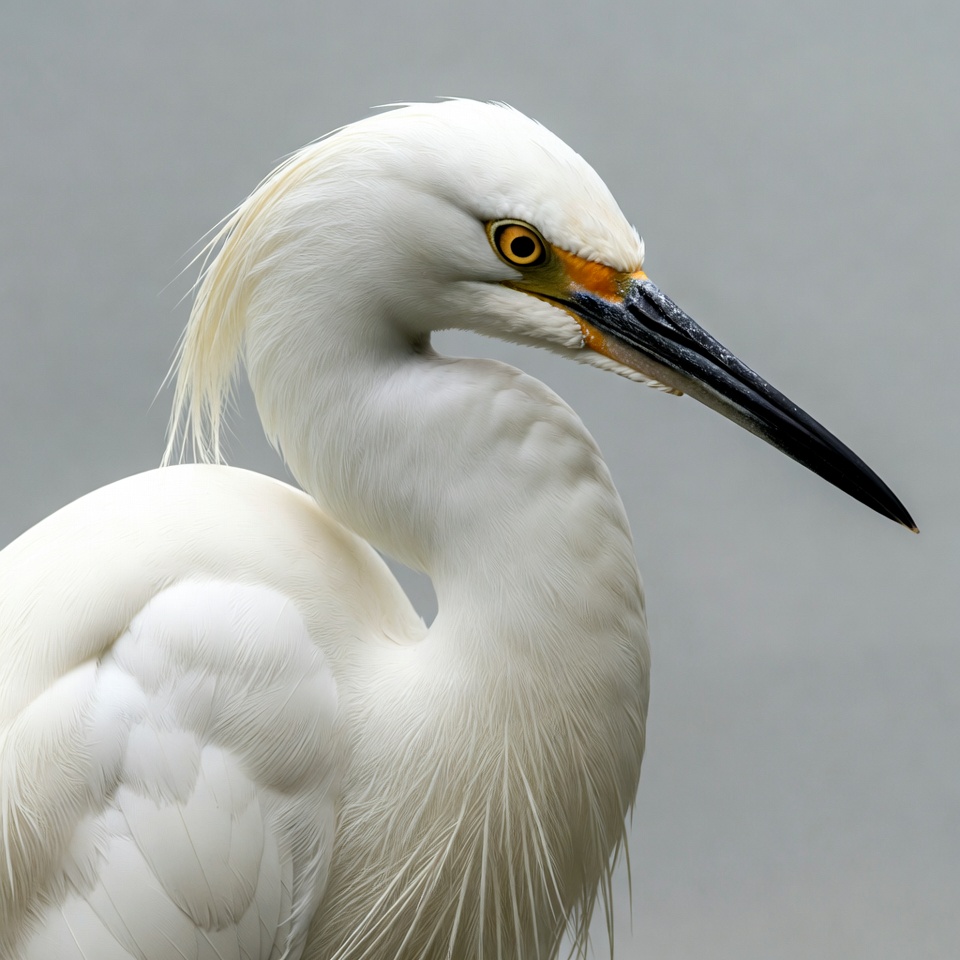 A snowy egret shows its profile, with a long neck and black beak. It stands still against a light gray background, eyes focused ahead.