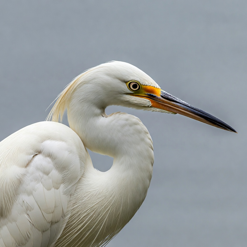 animal, beak, bill, bird, egret, eye, fauna, feathers, gray background, heron, long neck, natural habitat, nature, portrait, shorebird, water bird, white bird, wild, wildlife, yellow patch