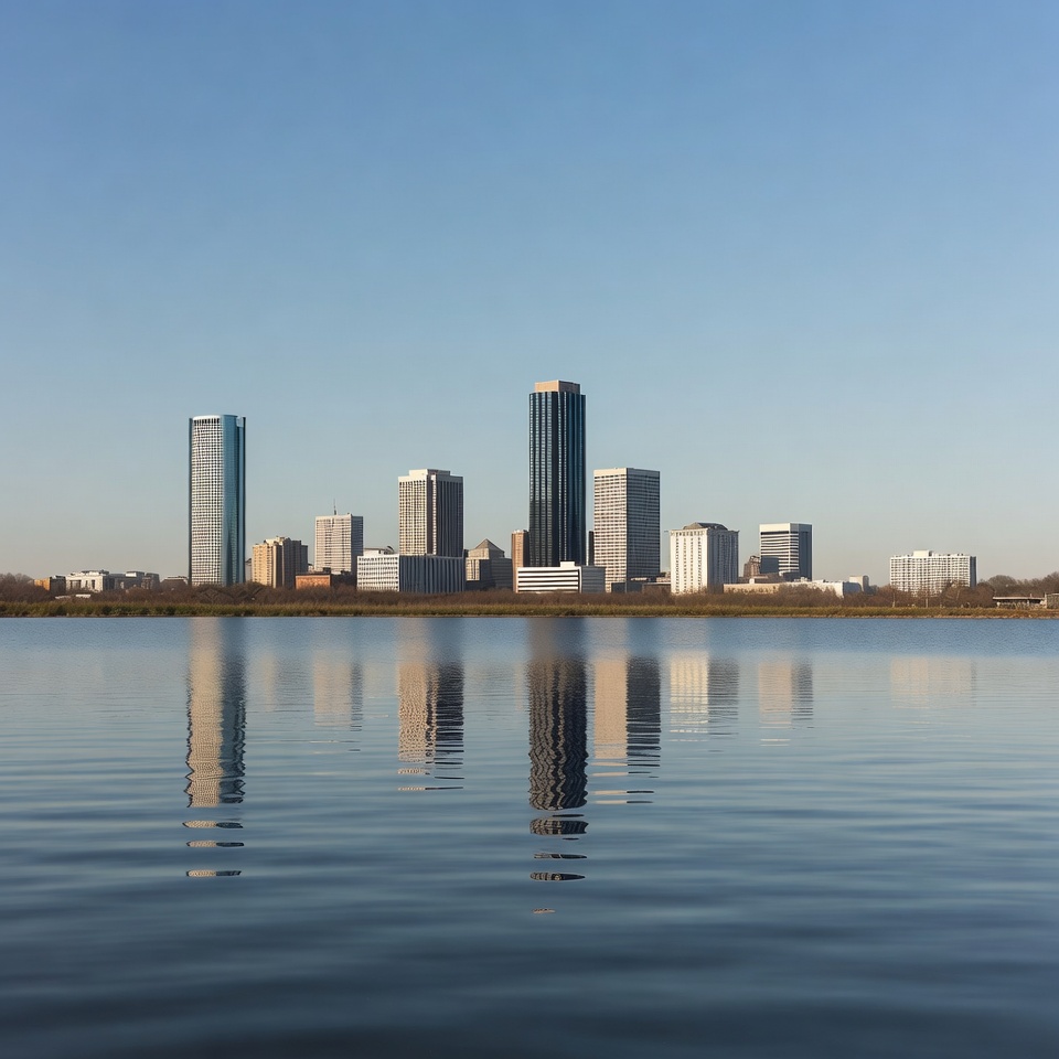 blue sky, buildings, city, clear sky, downtown, horizon, lake, landscape, modern architecture, nature, outdoor, outdoors, reflection, scene, skyline, structures, sunny day, urban, view, water