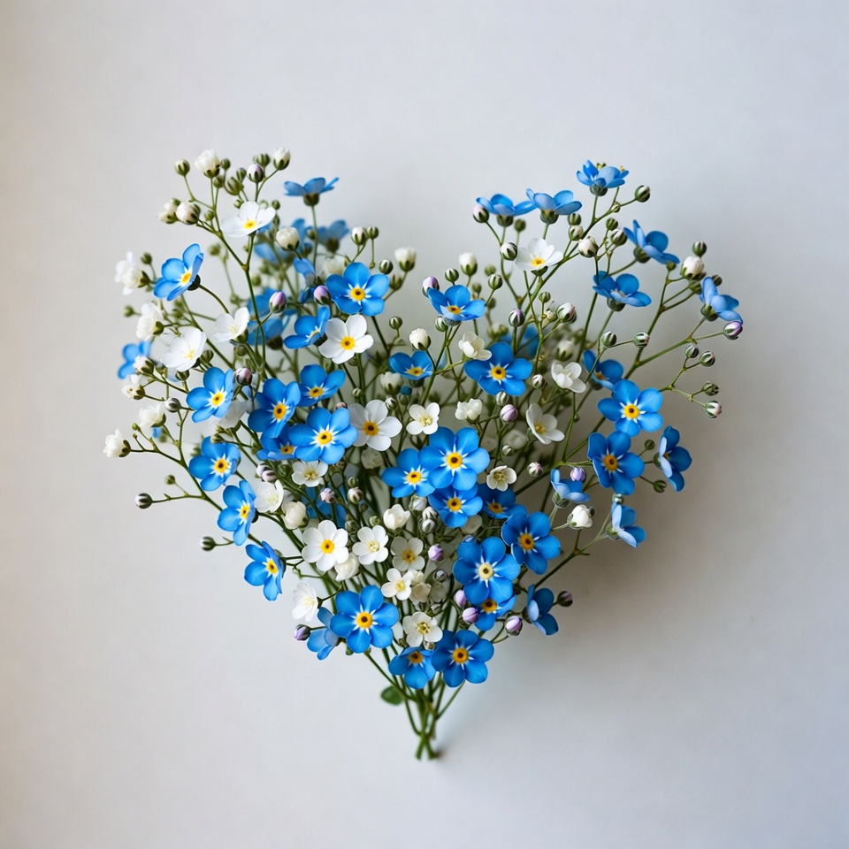 Small blue and white flowers arranged to look like a heart on a plain background, creating a simple floral decoration for various occasions.