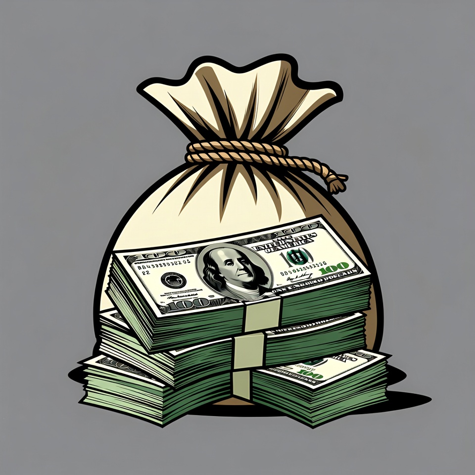 A large bag holds stacks of cash with bills visibly tied together. The money is placed on a gray background.