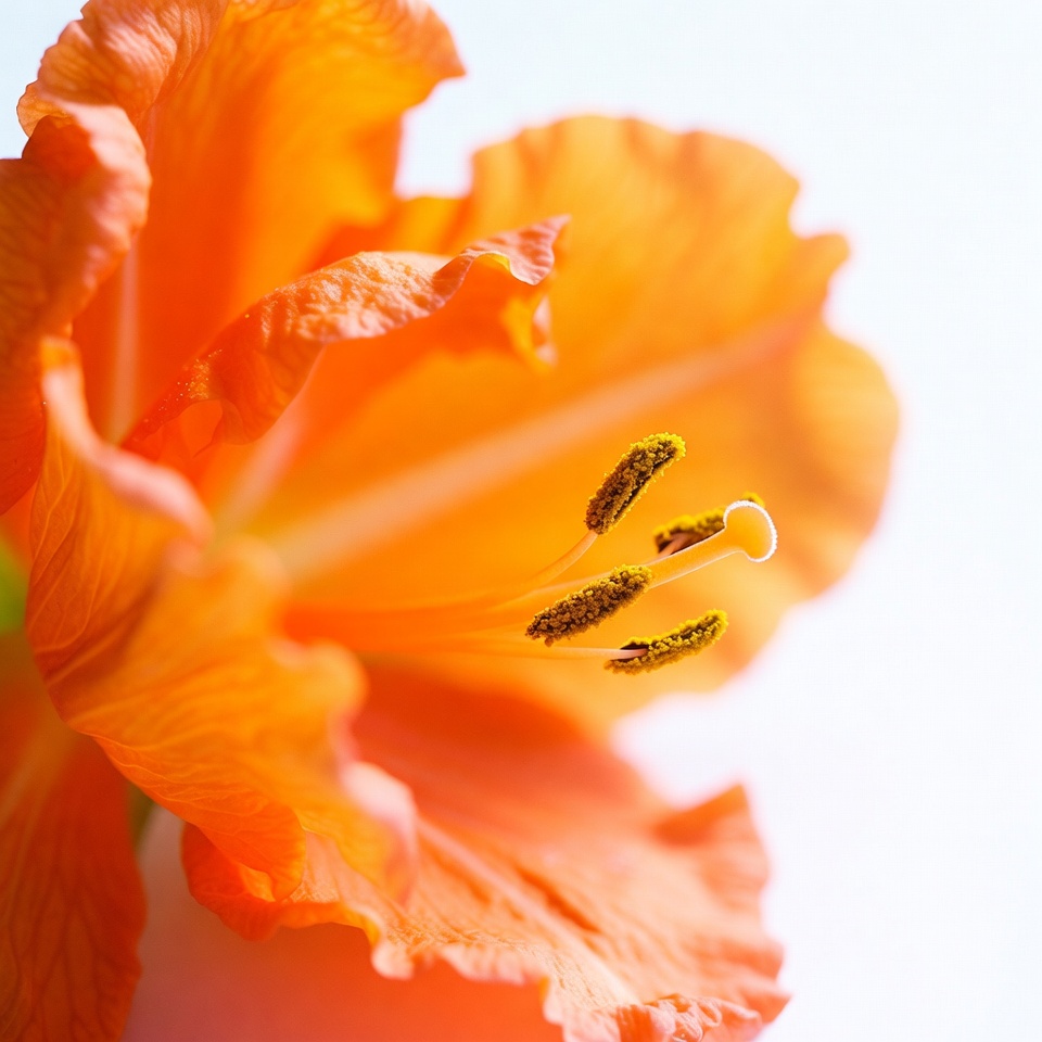 A vibrant orange flower displays its petals and pollen close-up. Light enhances the flower's details and colors.